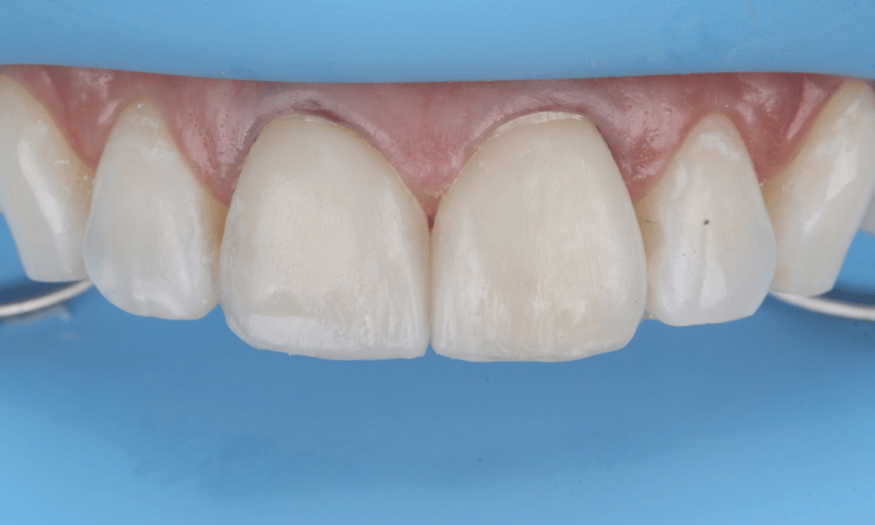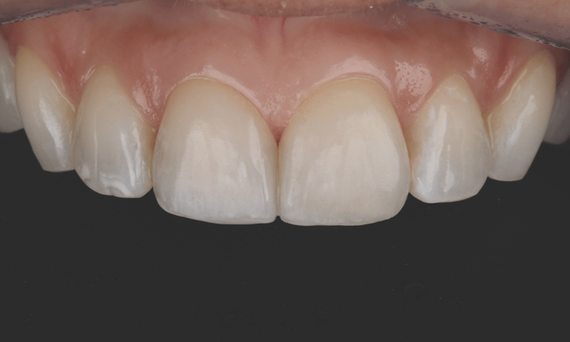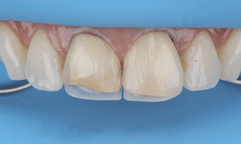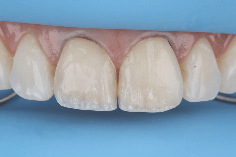 - Balancing Substrate Colors: To address the color differences between the substrates, a lighter dentin shade (B1D) is applied to the darker tooth (#11), and a darker dentin shade (A2D) is used for tooth #21 This ensures a balanced and natural appearance.