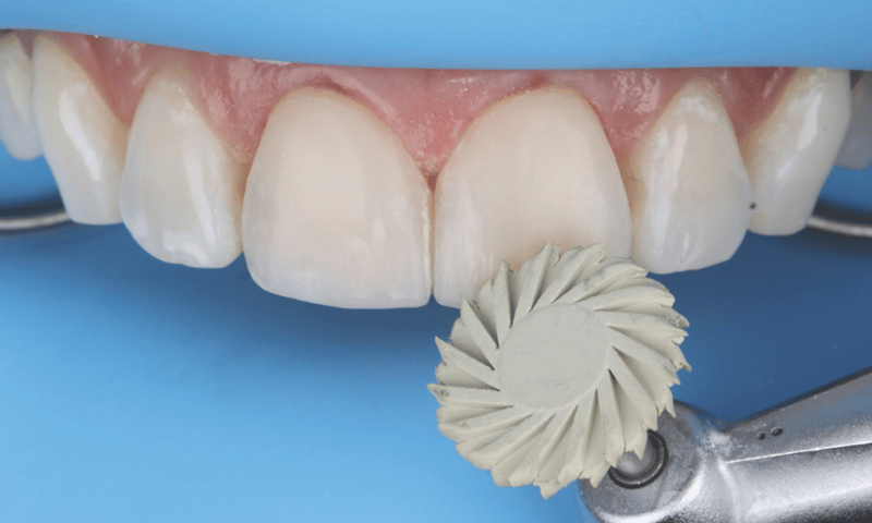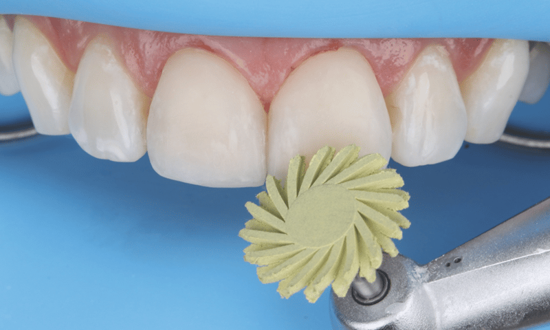 - Fine Polishing: Further polishing is done with the Jiffy Natural Fine spiral polishing wheel, enhancing the smoothness and shine of the veneers.