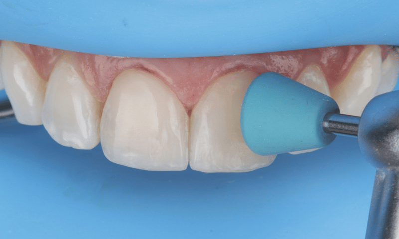 - Cord Removal and Initial Polishing: The Ultrapak cord is removed, and the teeth are polished using the Jiffy™ Natural Medium spiral polishing wheel. This step begins the polishing process, ensuring the veneers have a smooth surface.