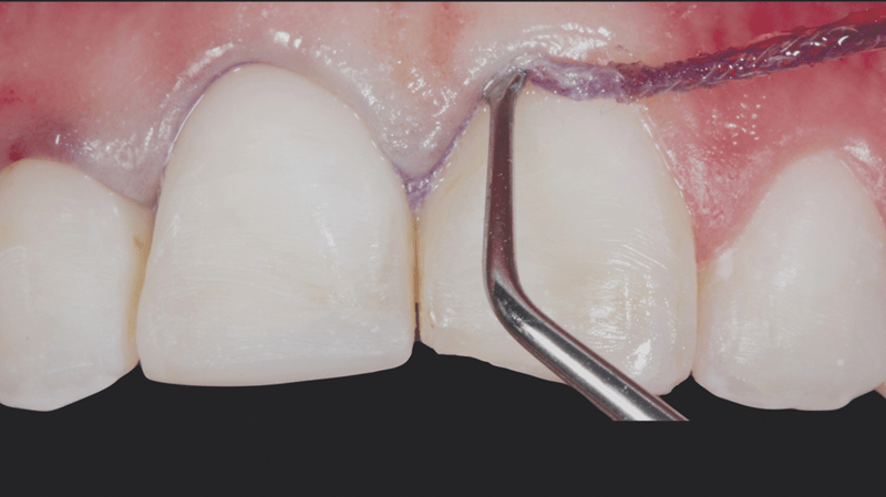 11. Gingival Sulcus Preparation: Ultrapak™ knitted cord Size #0 was packed into the gingival sulcus to prepare for etching.