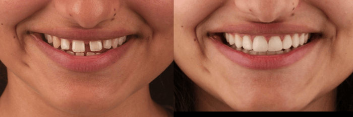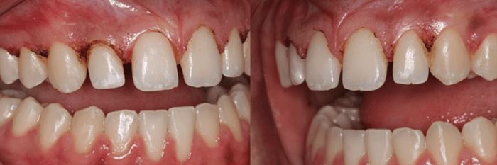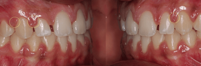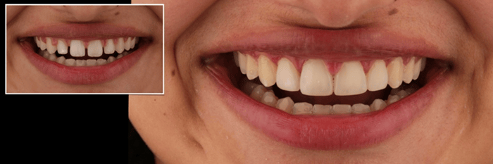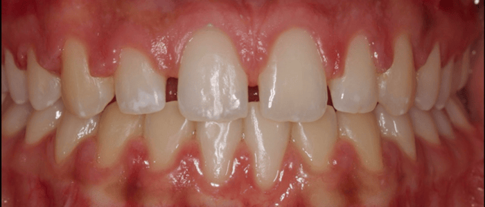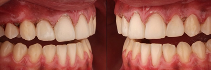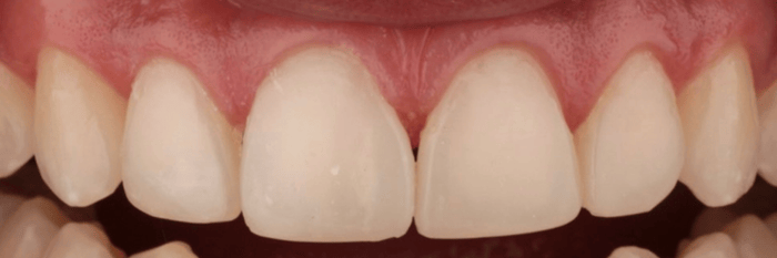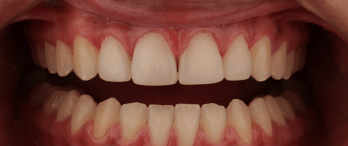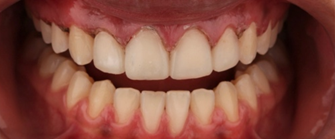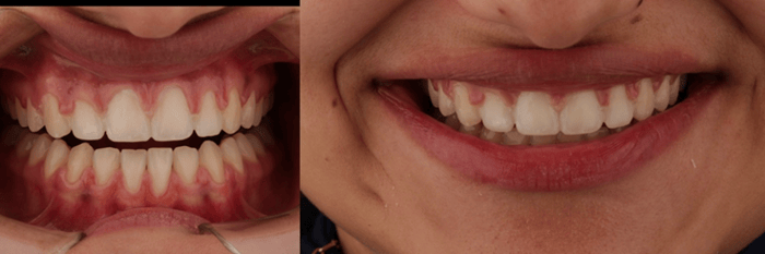 After completing the orthodontic treatment, the clinical situation showed a balanced occlusion and tooth alignment. However, significant interproximal spaces between the anterior teeth and irregularities in the gingival contour affected the overall appearance.